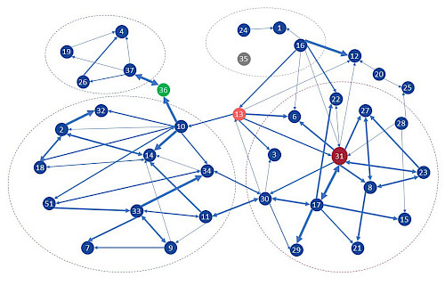 - Brokers: People who tie together otherwise disconnected people and sub-groups. Often they connect people that otherwise would be isolates. E.g. #36 is the only one to connect to an otherwise separated knowledge cluster.